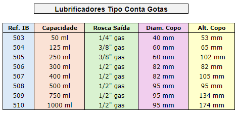 Lubrificador Tipo Conta GotasCod: IB-503Lubrificador para óleo tipo conta gotas fabricado em latão e copo em acrílico, possue regulagem de gotejamento e vazão.