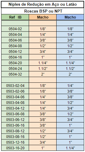 Niples de Redução em Aço ou Latão.Roscas BSP ou NPT, para maiores detalhes verifique a tabela.