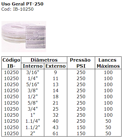 Uso Geral PT-250Cod: IB-10250Tubo de PVC transparente com reforço interno de poliester para serviços em geral com ar ou água.